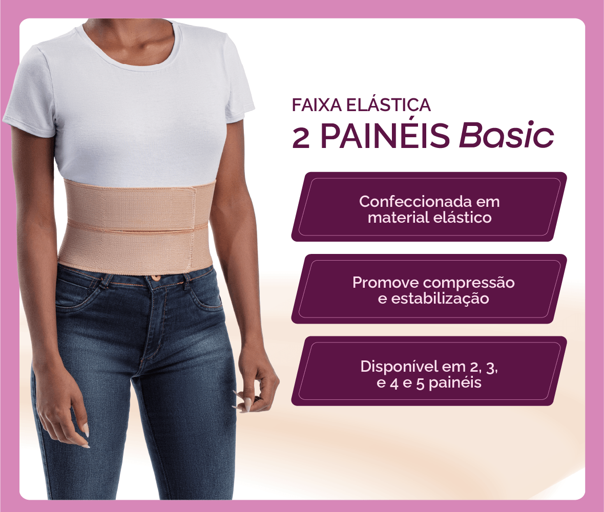 Posicione a Faixa Elástica de Painéis na região lombar de forma que as abas fechem em torno da região abdominal. Ajuste conforme a necessidade através do fecho aderente.