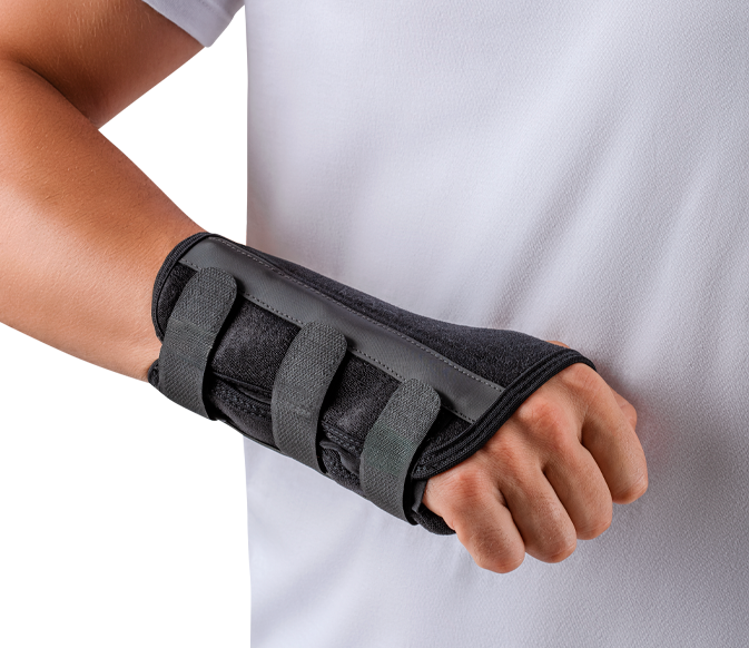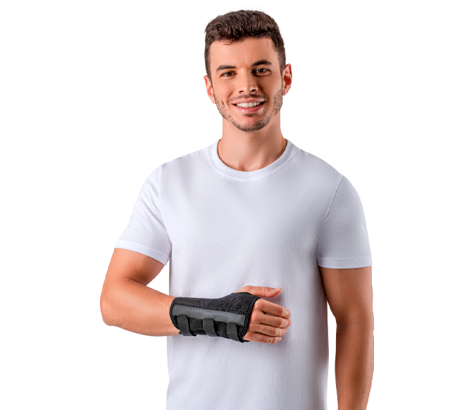 Aplicar conforme indicação. Solte as tiras aderentes. Vista o produto. Insira o polegar no orifício encaixando a curvatura da tala na palma da mão. Ajuste a compressão de acordo com a necessidade através das 3 tiras aderentes.